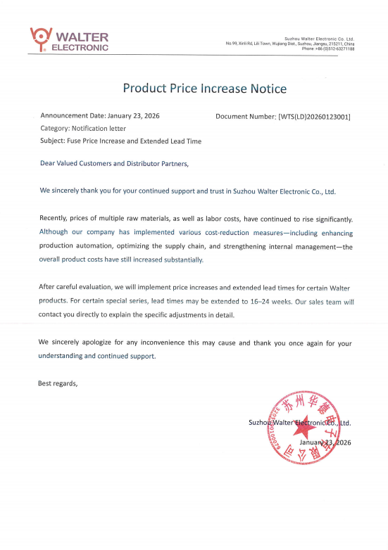 The price increase letter from Walter Electronics this time is mainly due to the skyrocketing prices of raw materials such as copper, tin, silver, and other metal materials. In order to ensure the normal operation of the product, the price has to increase. Below is the official price increase notice.