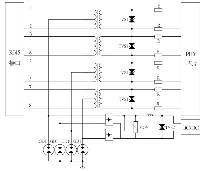 This scheme adopts GDT to perform common mode (eight wire) surge protection at the front end of the transformer
