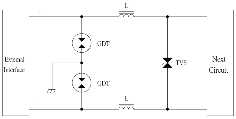 An inductor L is employed in the middle for decoupling and driving the GDT to discharge large currents